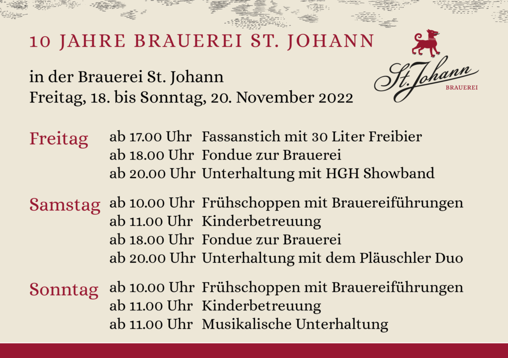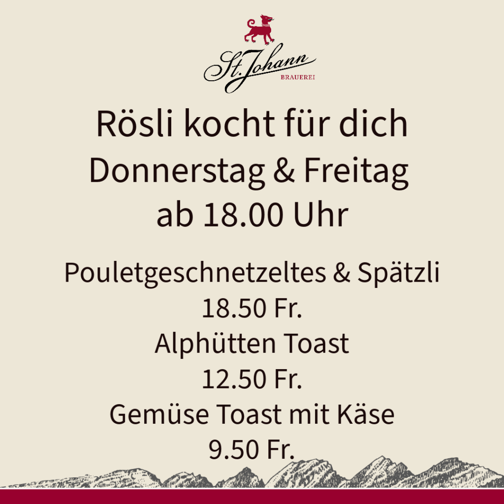 Geniesse eine entspannte Atmosphäre, treffe gleichgesinnte Freunde und stärke dich mit unseren köstlichen Bieren. Egal ob du einfach entspannen oder neue Bekanntschaften schliessen möchtest, die Brauerei St. Johann ist der perfekte Ort, um den Tag zu feiern.