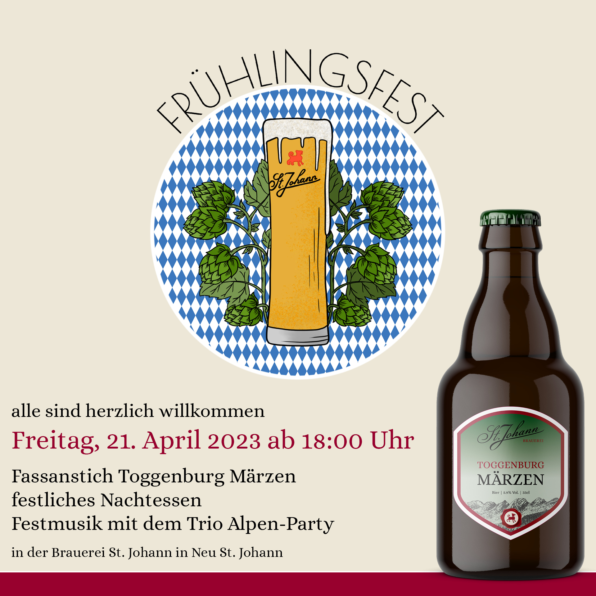 Feiere mit uns am 4. April 2025 den Fassanstich unseres neuen Suds Toggenburg Märzen! Der Frühling steht vor der Tür und wir freuen uns, diesen Anlass mit dir zu feiern.