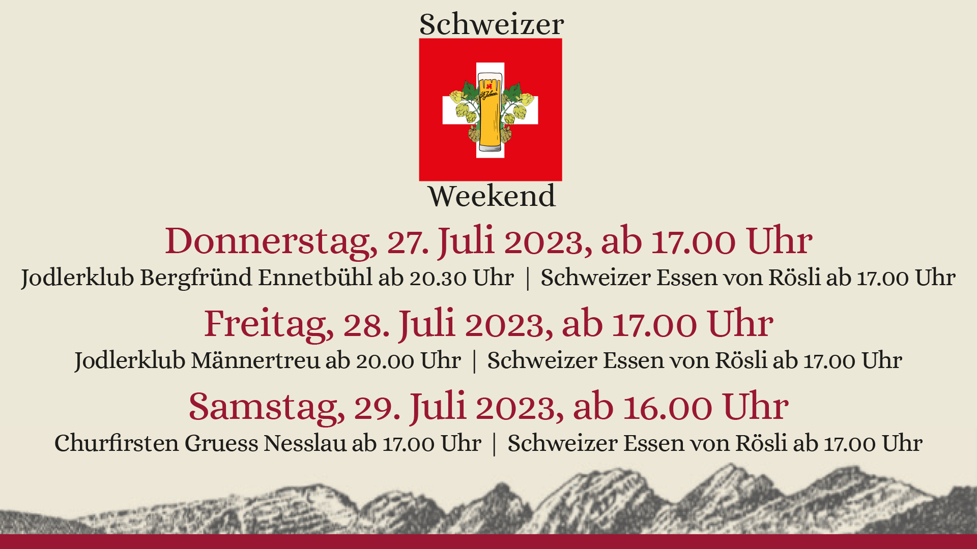 Erlebe zwei Tage voller Schweizer Tradition! Mit Live-Jodelmusik, feinem Schwiizer Essen und viel Gemütlichkeit.
