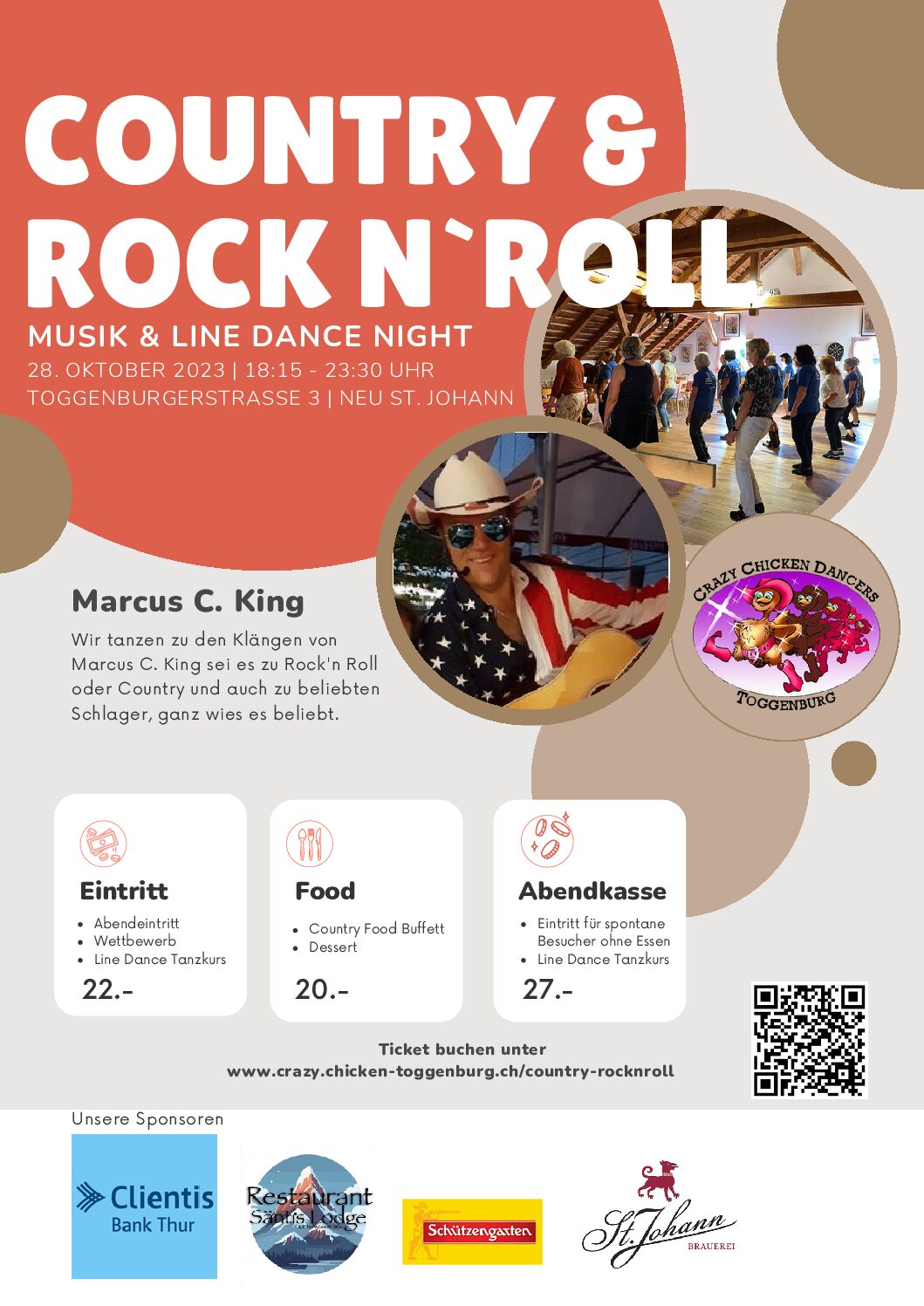 Mit Live Band und Tanzeinlagen von den Crazy Chicken Dancers. Lernt typische Line Dance Schritte und erlebt einen unvergesslichen Abend.