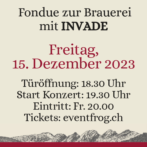 Erlebe einen unvergesslichen Abend mit der atemberaubenden Band INVADE live auf der Bühne! Nach dem grossen Erfolg des letztjährigen Events kehren sie nun zurück. Für nur 20 CHF Eintritt kannst du in die Welt der mitreissenden Musik eintauchen. Geniesse dazu verschiedene köstliche Fonduevariationen und hervorragendes Bier. Sichere dir jetzt dein Ticket für einen Abend voller Spass und Genuss!