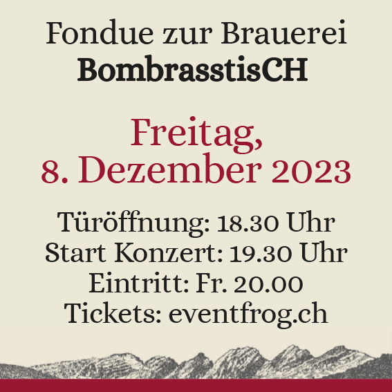 Der heimelige Brauereisaal wird zur Fonduestube! Geniesse ein feines Fondue im gemütlichen Ambiente. Dazu gibt es passende Biere aus der Brauerei St. Johann und musikalische Unterhaltung von der Toggenburger Band BombrasstisCH.