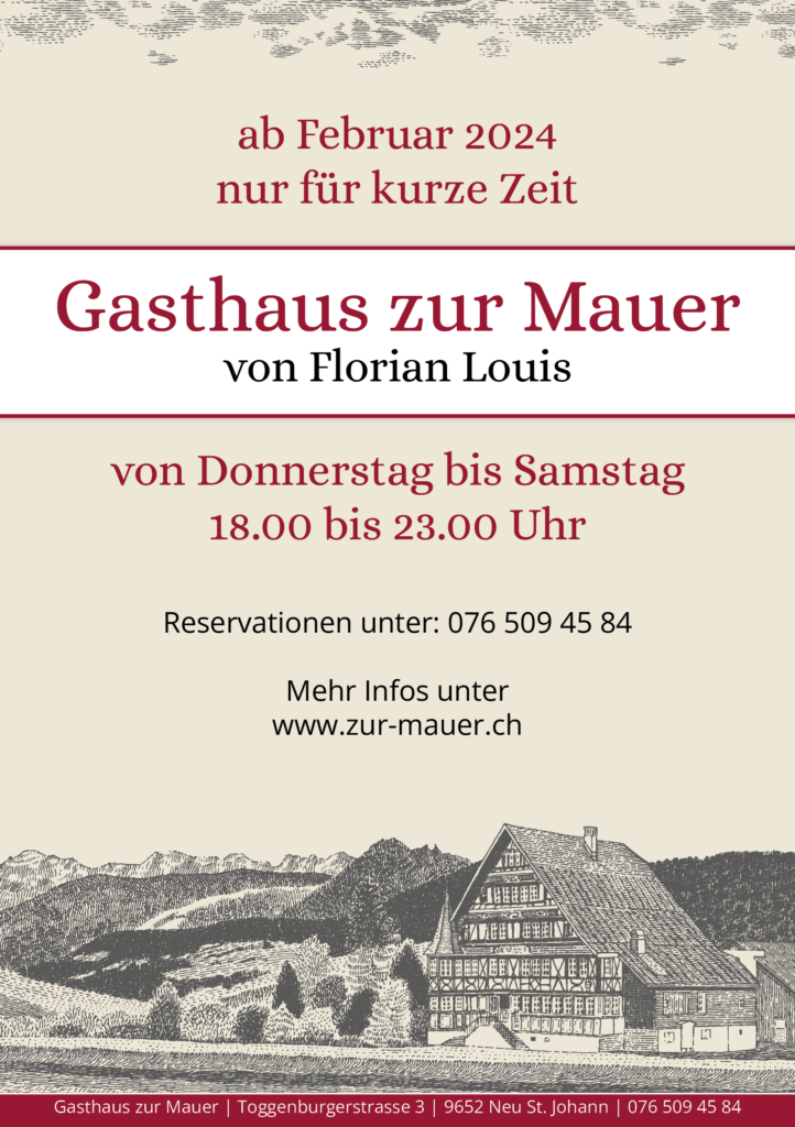 Für kurze Zeit öffnet das Popup-Restaurant an der Toggenburgerstrasse 3 seine Türen. Ab Donnerstag, 1. Februar 2024 kann man sich im Restaurant zur Mauer von Florian Louis kulinarisch verwöhnen lassen. Regional, klein und fein, so viel sei verraten. Doch lassen wir uns gerne überraschen.