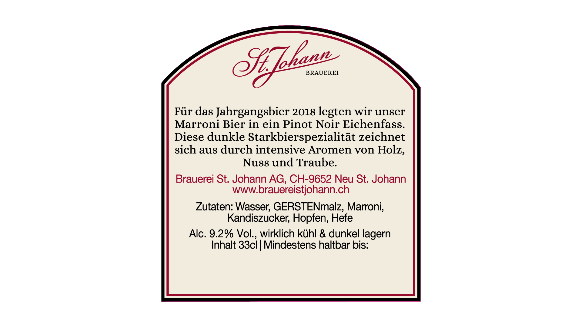 Für das Jahrgangsbier 2018 legten wir unser Marroni Bier in ein Pinot Noir Eichenfass. Diese dunkle Starkbierspezialität zeichnet sich aus durch intensive Aromen von Holz, Nuss und Traube.